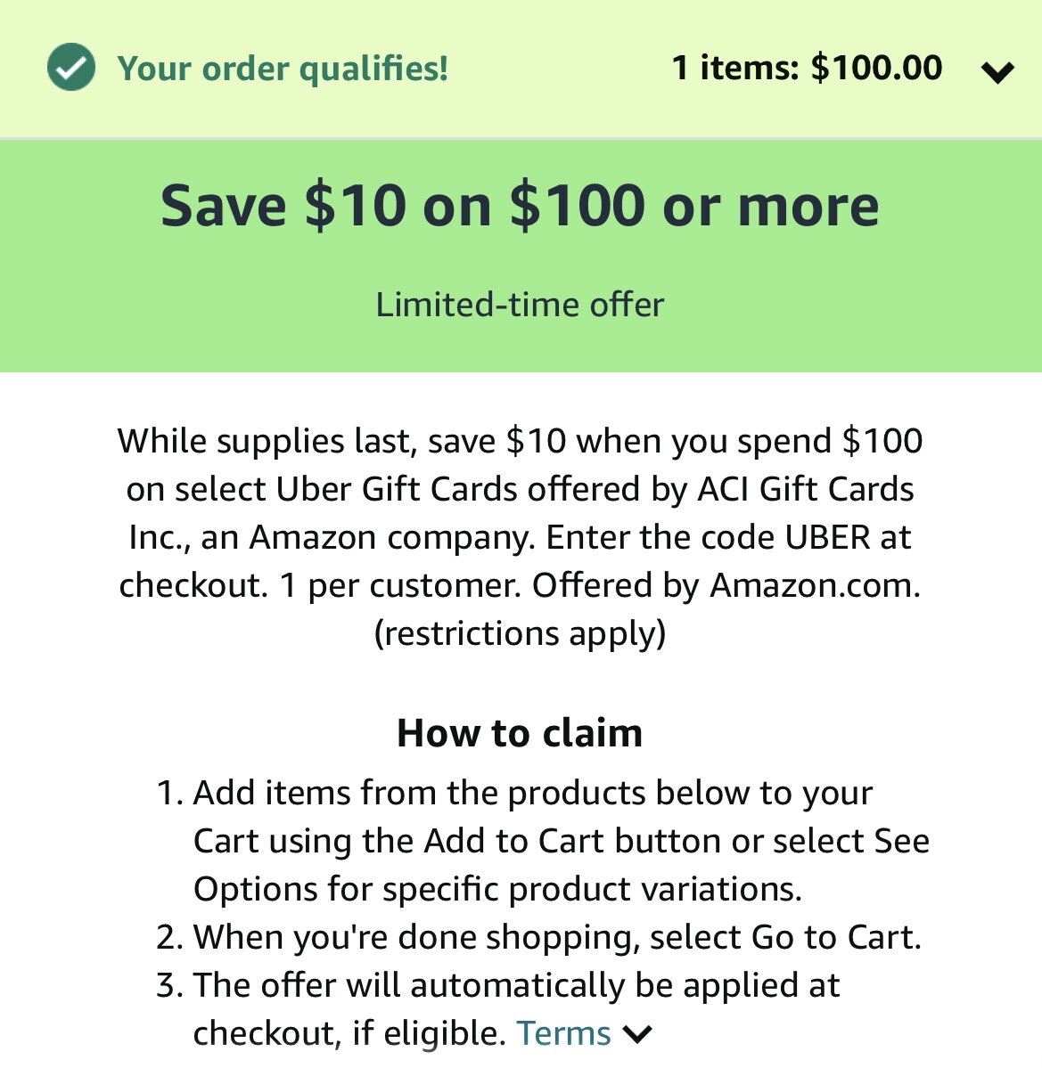 刚才用raise买了uber的九折礼卡,再叠加promo: 15PERCENT,76买了100的,这个码新用户才可以用,最多减20