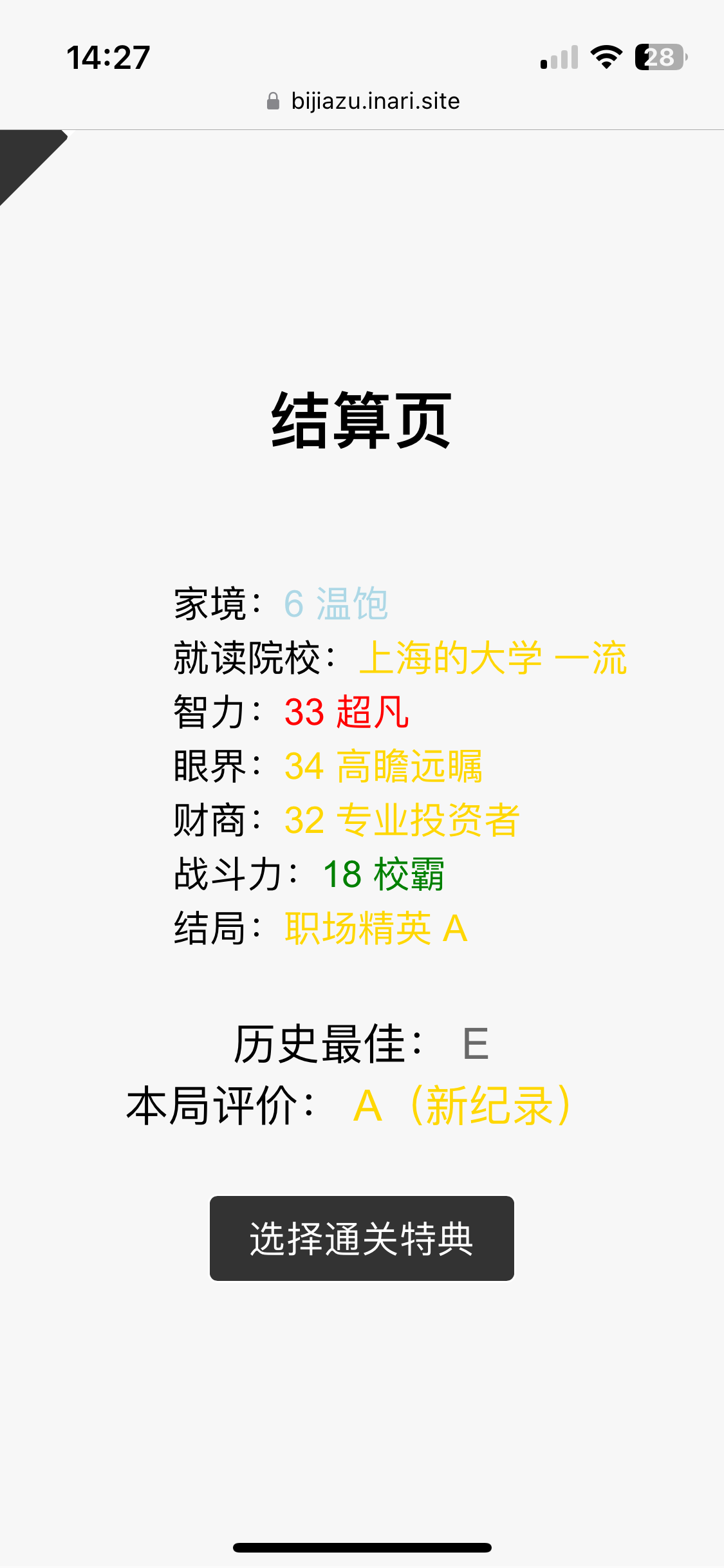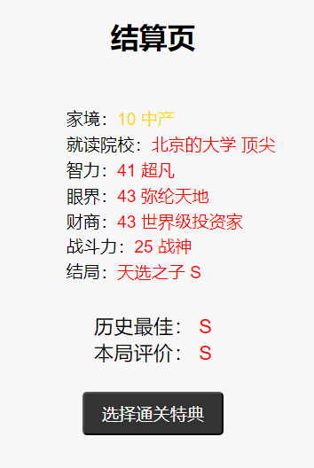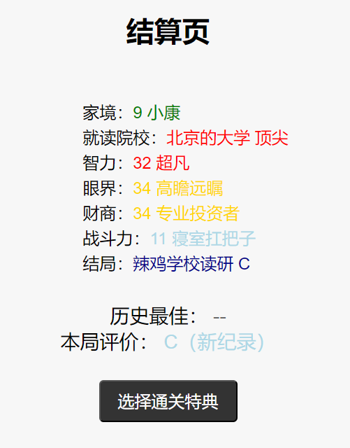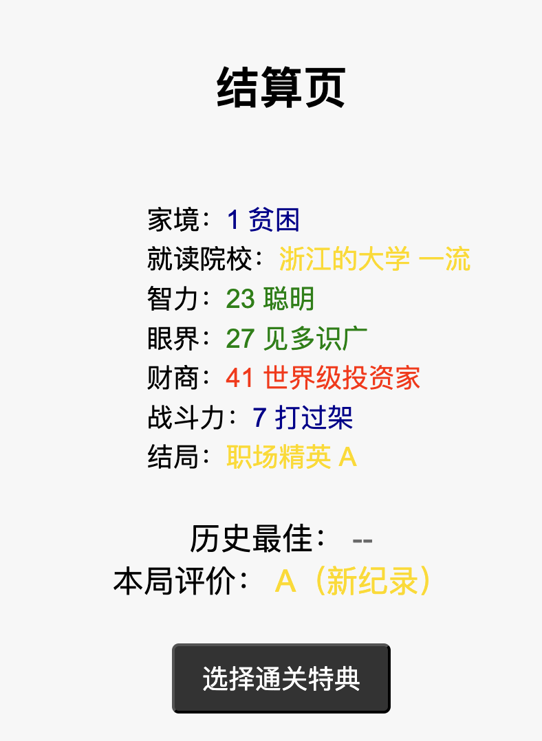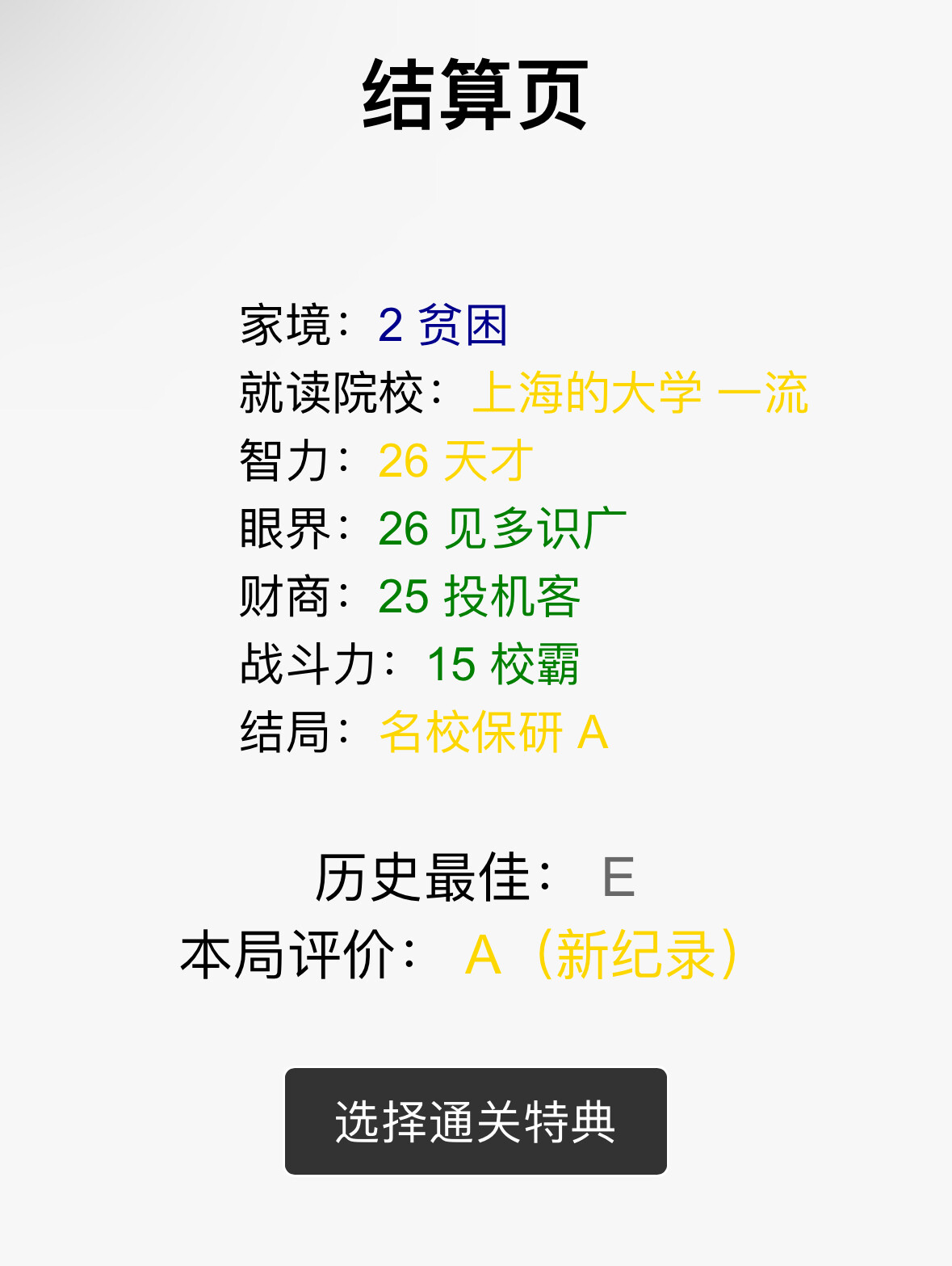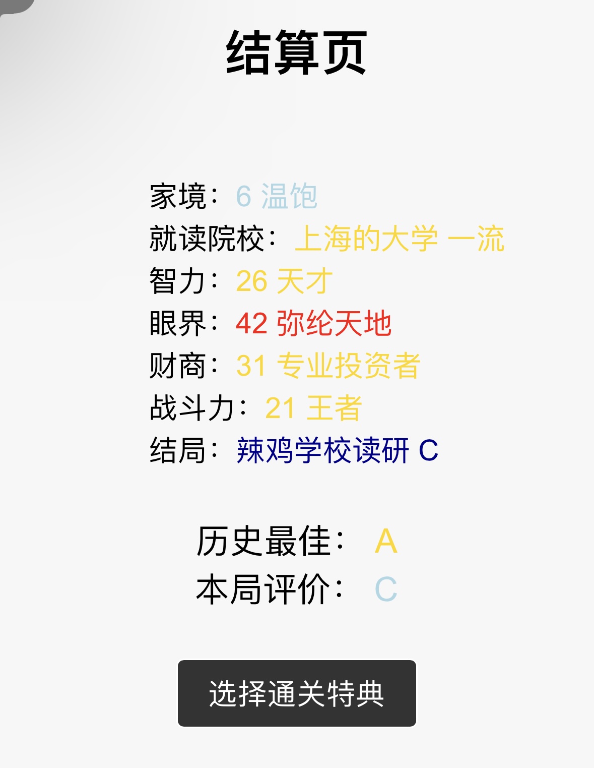 这局我随到一个天才,入学开始一路到大四所有课程全A,到最后我都不买答案了,我发现这个人硬考也是全A。然后就一路寻衅滋事,旅游躺平,啥不学习干啥,最后被暗害去辣鸡学校读研 ![]()