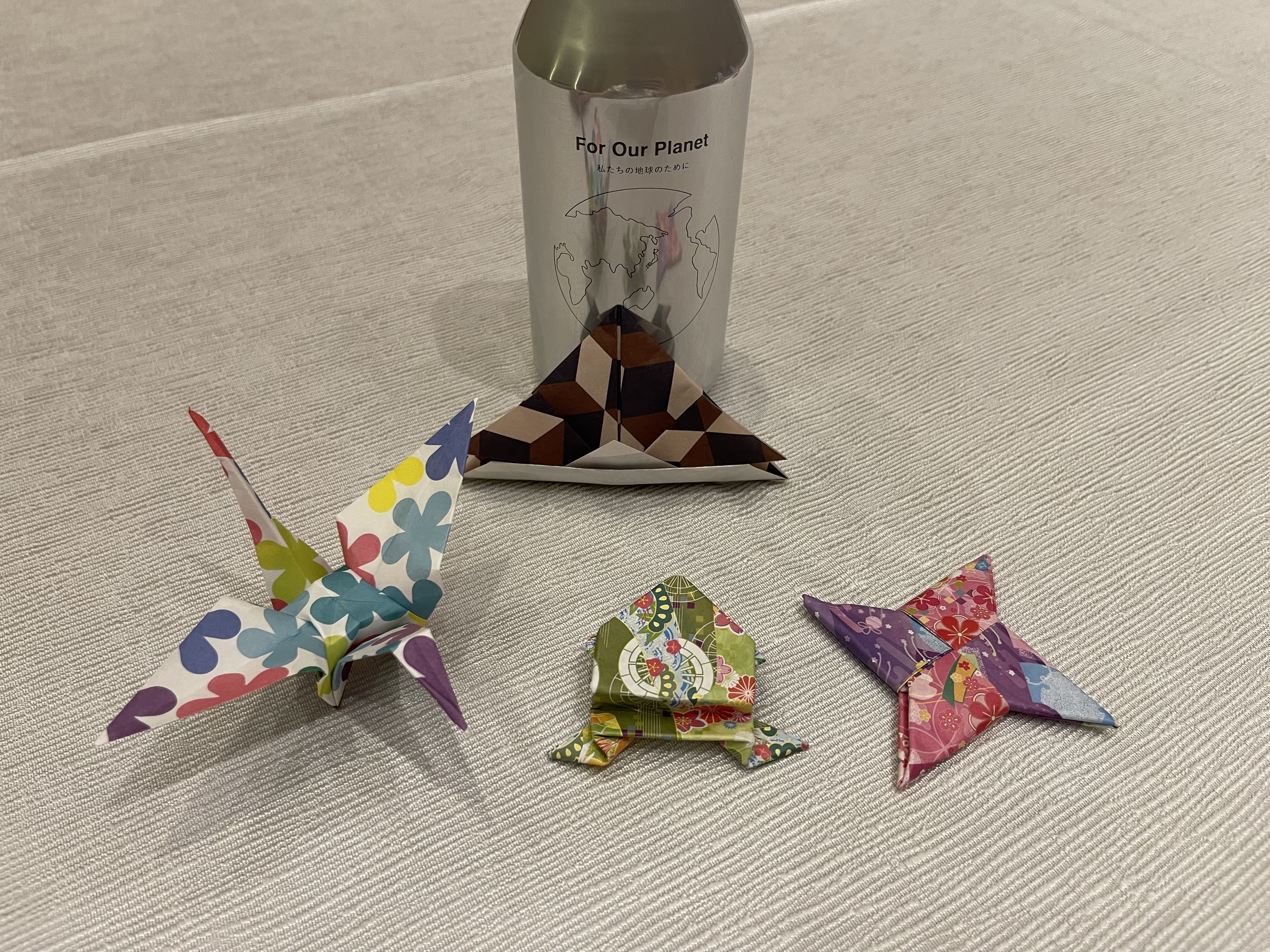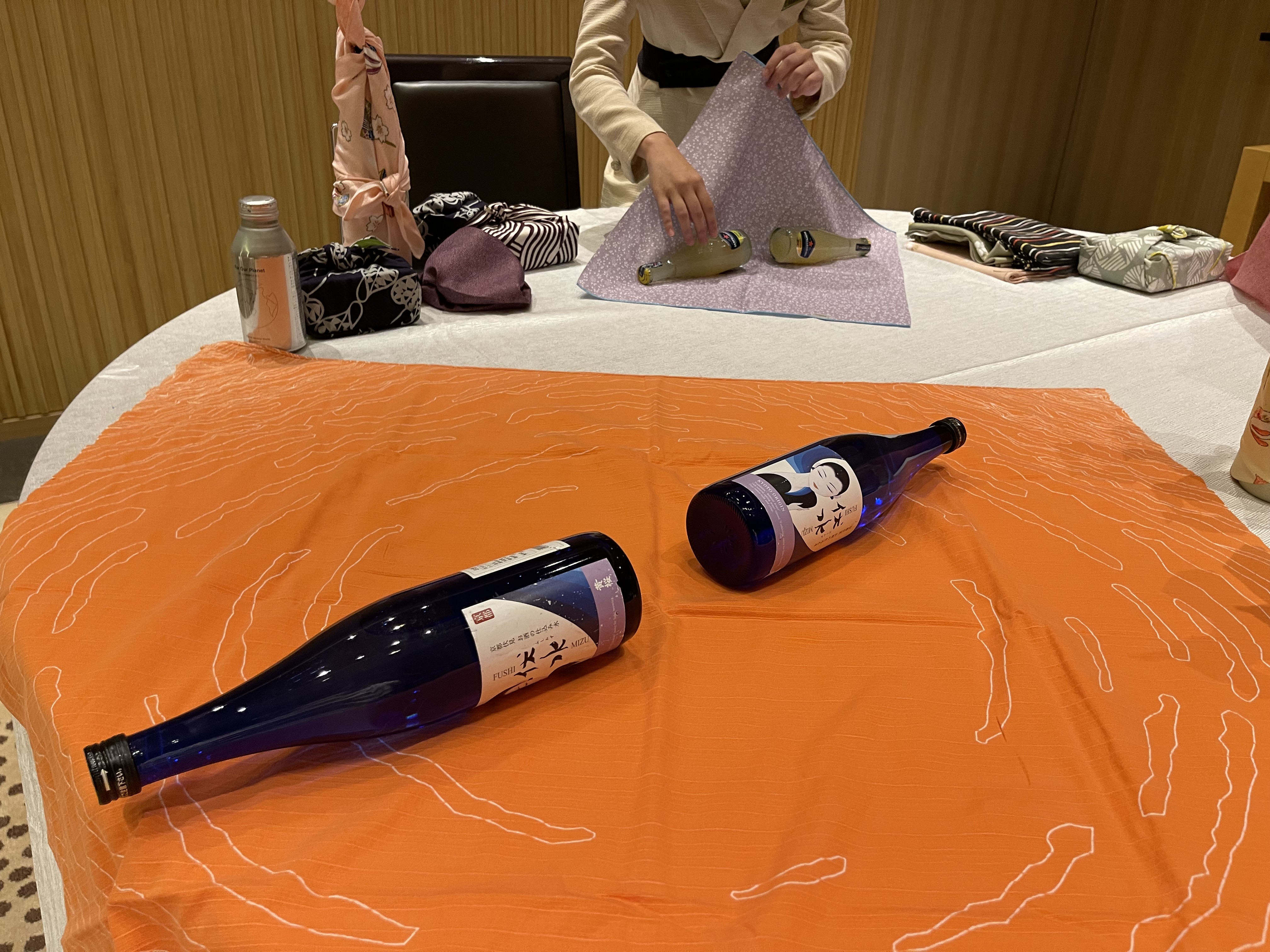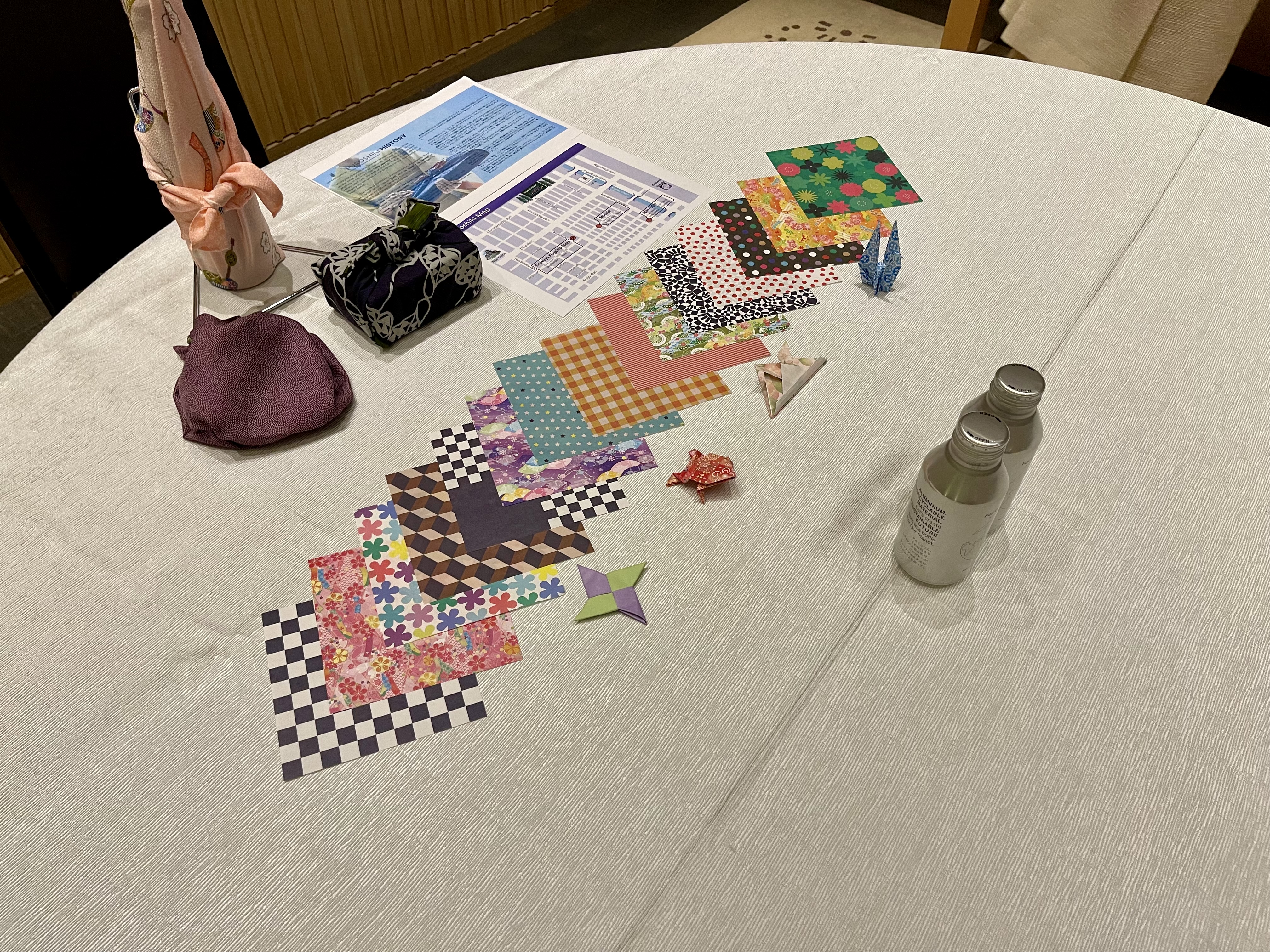 这两个是一起做的,小姐姐单独拉我们到楼下的一个小房间,折纸就是小时候很基础的那些青蛙千纸鹤什么的,wrapping art很有意思,教我们如何用一块布打包饭盒、酒瓶、两个酒瓶、做布袋。折纸最后可以带走,小姐姐还给我们拍了照打印出来放进相框里做纪念。总计时间一小时。