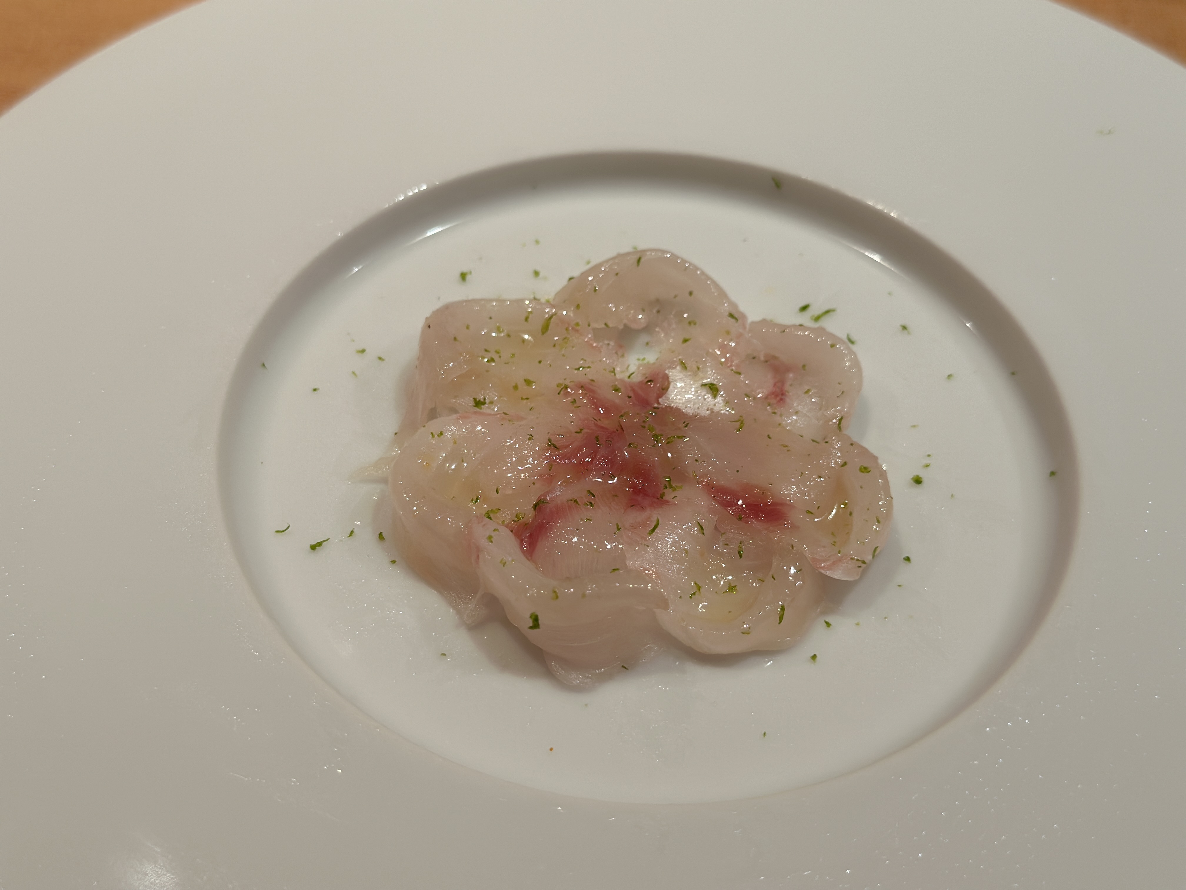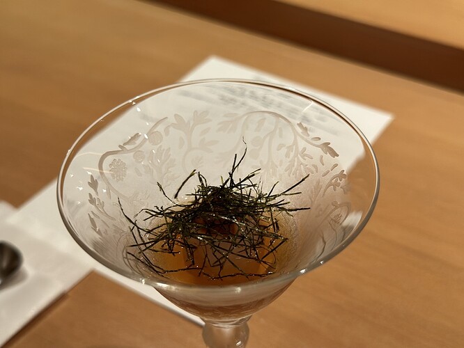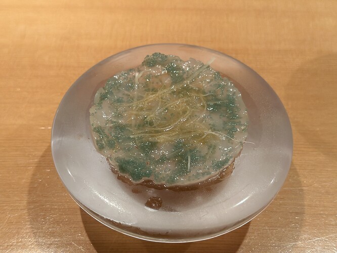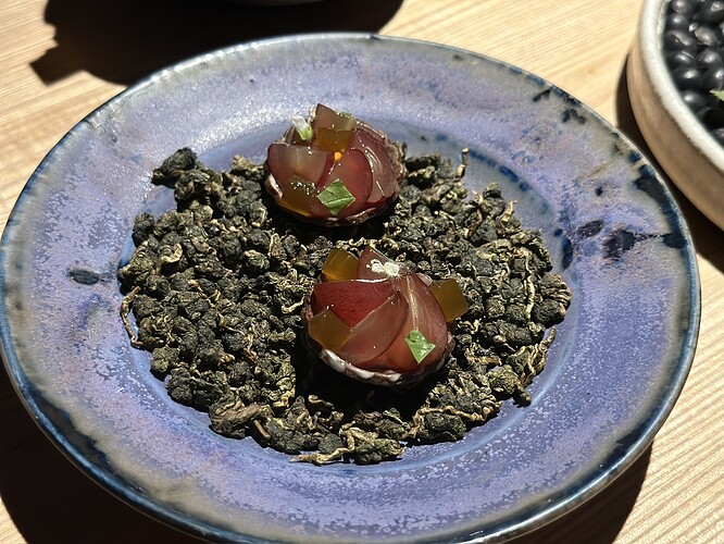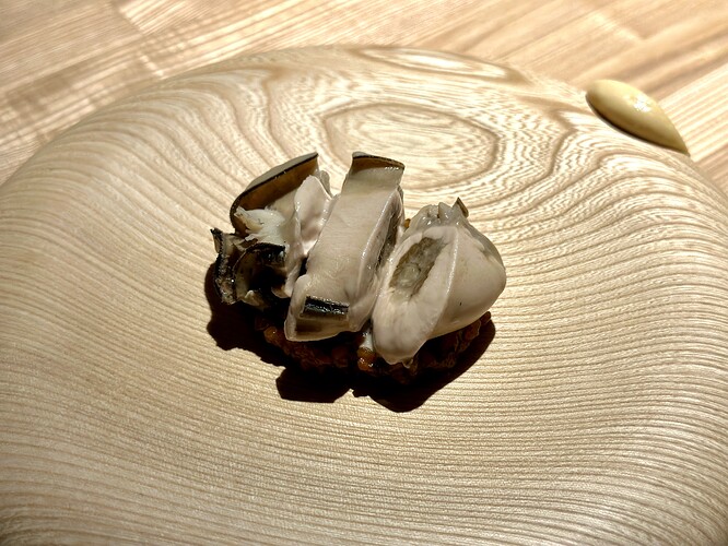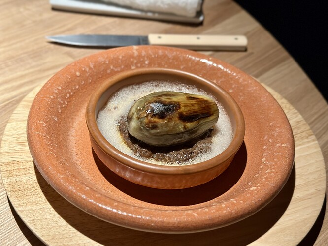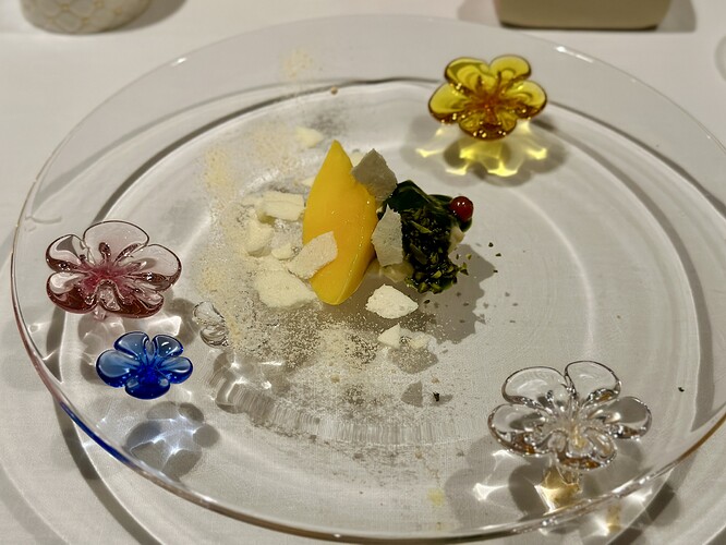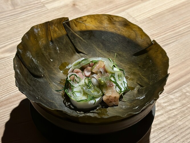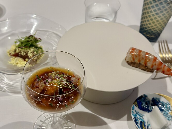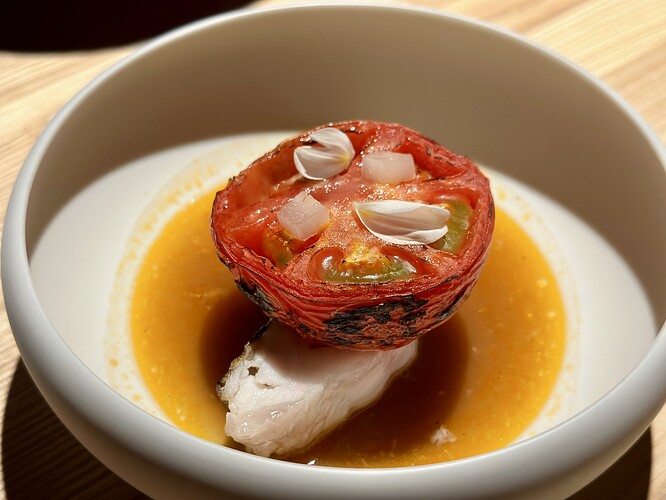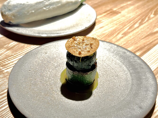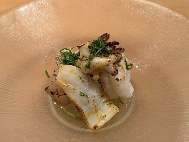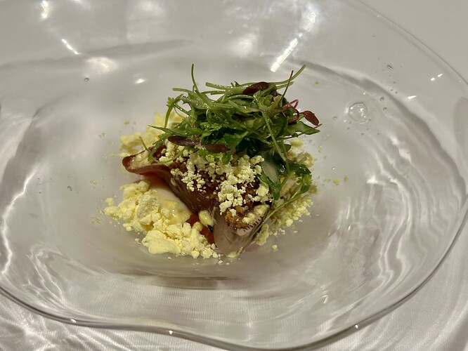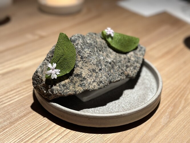 Respiracion,日本第二的日式西班牙餐厅。第一道甜虾的菜品正如其名,虾籽,虾脑,还有虾肉,三重的鲜甜带来了强烈的冲击。Respiracion在蔬菜上的造诣及其了得。一节西葫芦做成慕斯冷吃,艾草炼成精油增香,莼菜过着啫喱,是一道菜。另一节西葫芦热吃,在炭火上烤出焦香激发甜感,菠菜包裹的火鸡丸子散发出饱满的肉香,又是另一道菜。随后一道蔬菜料理,主食材茄子用奶酪熟成数日,辅料选择熊肉肉酱增添几分狂野。主菜前的清口小吃是雪利酒腌制的小番茄,酸酸甜甜特别爽口。我最喜欢的是菜品是第一道甜品,能登衫。酸奶油铺底,一层抹茶,一层奶冻,一层猕猴桃果酱,再淋上能登衫的树油。杉树的清香升华了牛奶的醇厚,抹茶的浓香,猕猴桃的酸甜,所有味道糅合得恰到好处,好吃。这家店曾是米其林二星,如果米其林恢复北陆指南的话,这一家店一定会有一颗绿星。美中不足是Paella中生蚝的风味过于强烈,打破了味道的平衡,感觉一般。也是一家想要再次拜访的餐厅。
