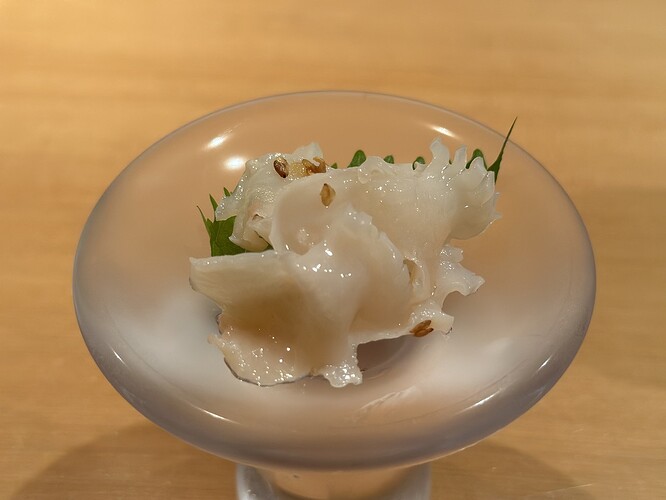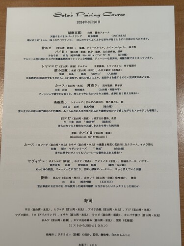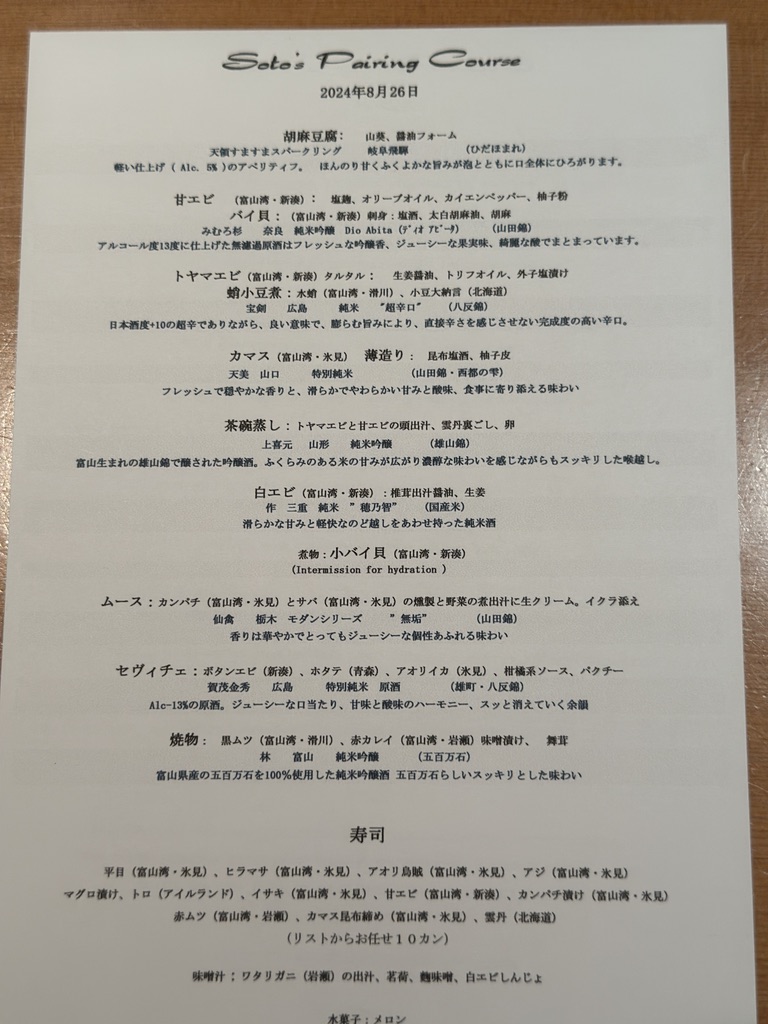 吃了一家高档寿司 SOTO,tabelog 评分3.85,米其林在2019年给了二星。主厨&老板小杉外博是一位健谈,平易近人,充满人格魅力的老爷爷。他曾经在纽约开高档寿司店,同名SOTO,同样是米其林二星。据本人称,从美国回日本的契机是因为妻子的身份问题。绿卡问题困扰着每一个人。套餐一个人22000日元,12道前菜+12贯寿司,以米其林二星的水准来看,这家店的性价比很高。选用的白エビ(白虾)、バイ貝、アカリイカ(荧光乌贼),赤ムツ(喉黑鱼)都是富山湾特产。大部分的食材都来自于富山湾,除了小部分的来自于北海道,甚至爱尔兰。大将是个古典音乐爱好者,店里头的背景音乐一直在放,本人没什么研究,听不出来。整一顿饭吃了大约3个多小时,用餐节奏舒缓但绝不沉闷,优雅而轻松自在。说到底是在纽约做过菜的,大将在设计酒肴的时候加入了不少别出心裁的想法。这是一家我希望再次拜访的好店。