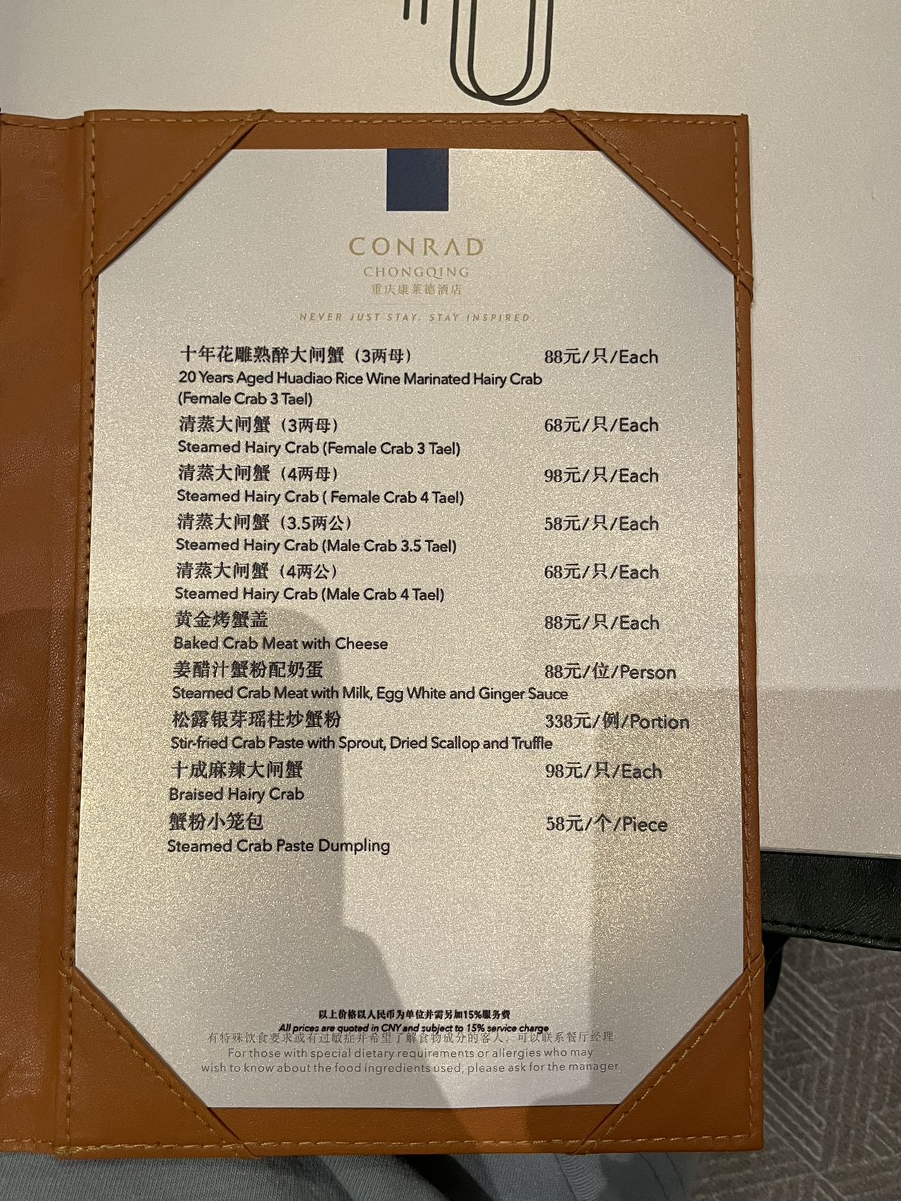 FHR credit都用在了中餐厅,西餐厅没去尝试。第一次只有正常的菜单,第二次给了额外的大闸蟹菜单,应该是才到的货。