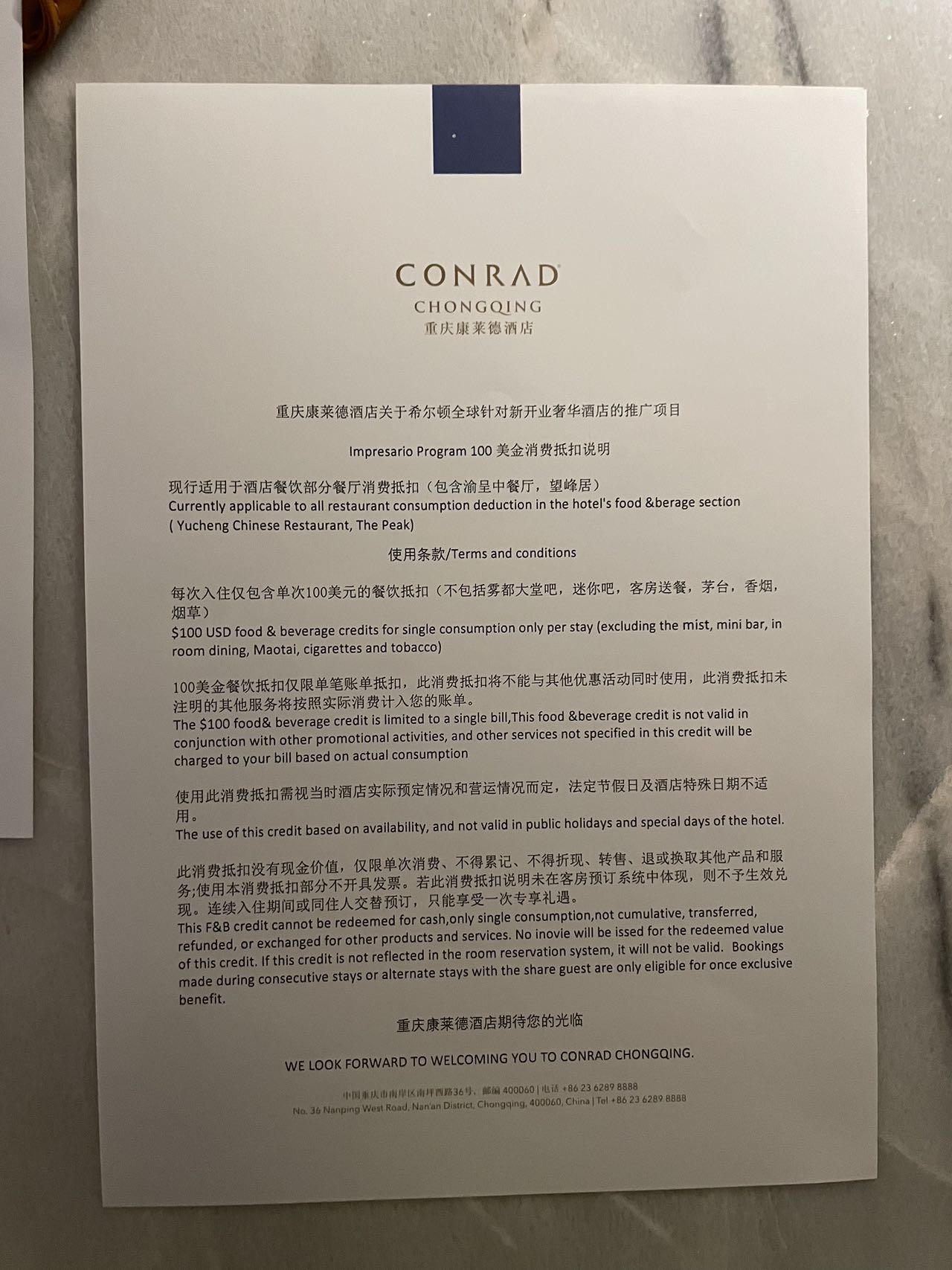 这次重庆住了三天,中间一天切出去解放碑凯悦,首尾两天用的FHR,刚好200刀一晚。