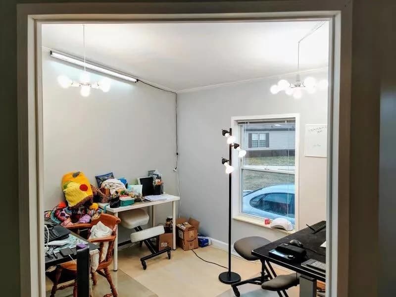 落地灯可以随意选购,我买的是这个hd三头的,面积实在有限买5头的也可以,但是需要离桌子稍远一点,不然太亮了。我的200sq ft 书房方案是2个三头灯,在远离书桌的角落各放一个