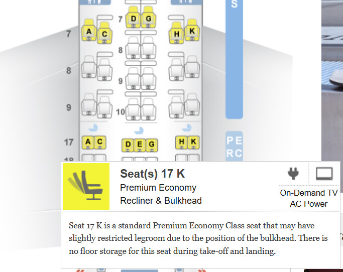 发现第一排是黄色的,说bulkhead的关系所有legroom会受限制,就有点纳闷了,一般来说bulkhead不是有更多legroom吗?