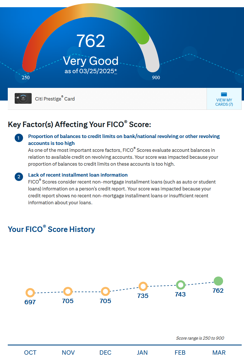 Citi用的是FICO Score(不确定具体是哪个模型),分数是762.
