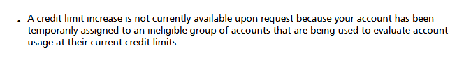 A credit limit increase is not currently available upon request because your account has been temporarily assigned to an ineligible group of accounts that are being used to evaluate account usage at their current credit limits