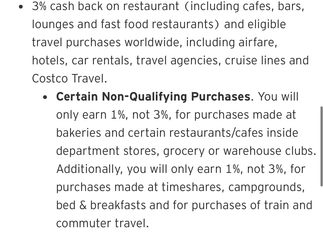 Merchants in this category include airlines, hotels, motels, timeshares, car rental agencies, cruise lines, travel agencies, discount travel sites, campgrounds and operators of passenger trains, buses, taxis, limousines, ferries, toll bridges and highways, and parking lots and garages. Some merchants that provide transportation and travel-related services are not included in this category; for example, real estate agents, educational merchants arranging travel, in-flight goods and services, on-board cruise line goods and services, sightseeing activities, excursions, tourist attractions, RV and boat rentals, merchants within hotels and airports, public campgrounds and merchants that rent vehicles for the purpose of hauling. Purchases from gift card merchants or merchants that sell points or miles will not qualify in the travel category.