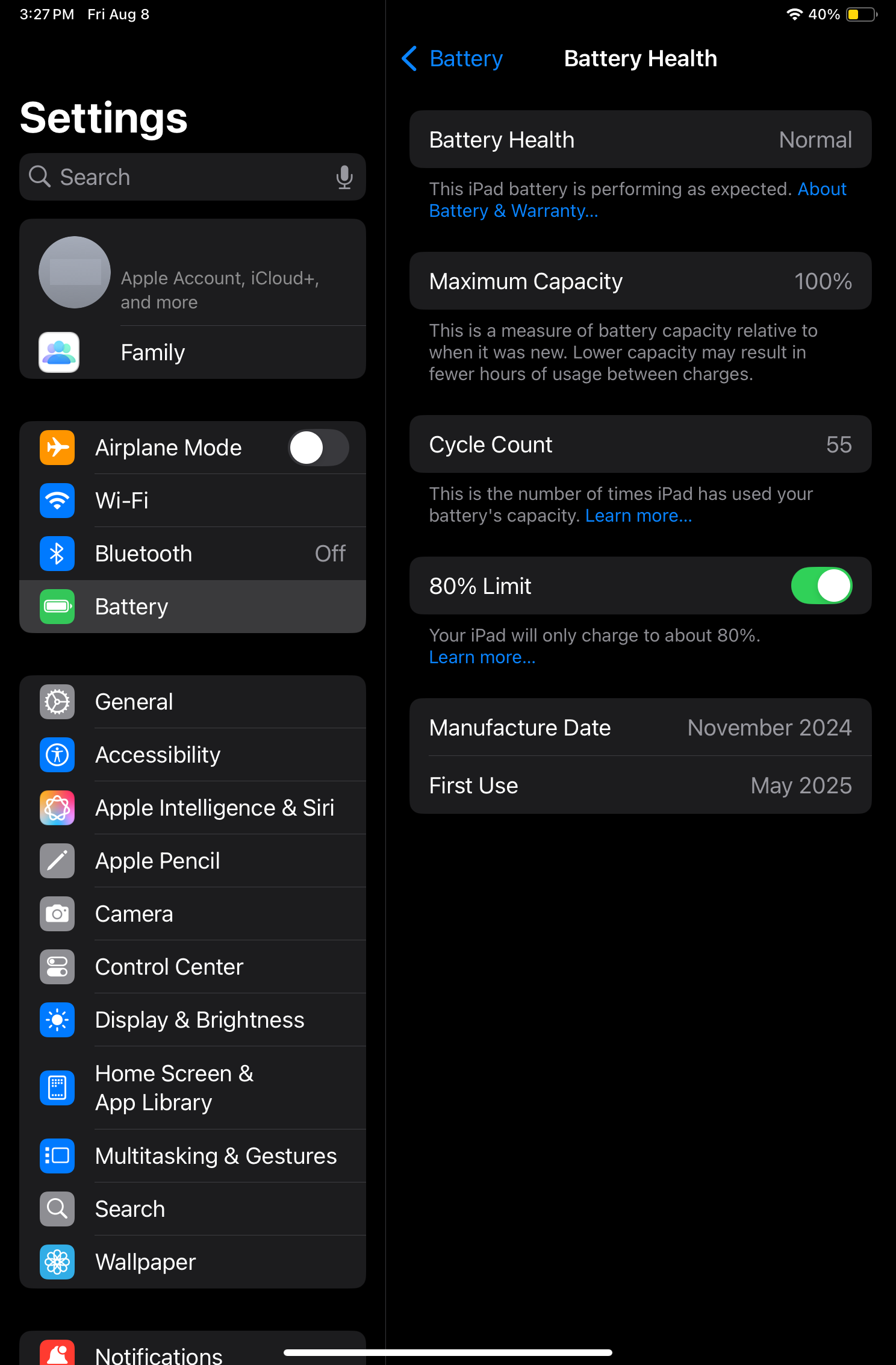 yes and no. 新版ipad是可以这样做的(设置charging limit和看capacity/cycle count),但某个时间之前(如我的m2 ipad pro 12.9)的ipad即使更新到最新系统,battery设置里也是什么都没有,只能通过analytical data看。这就是苹果锁硬件版本邪恶之处