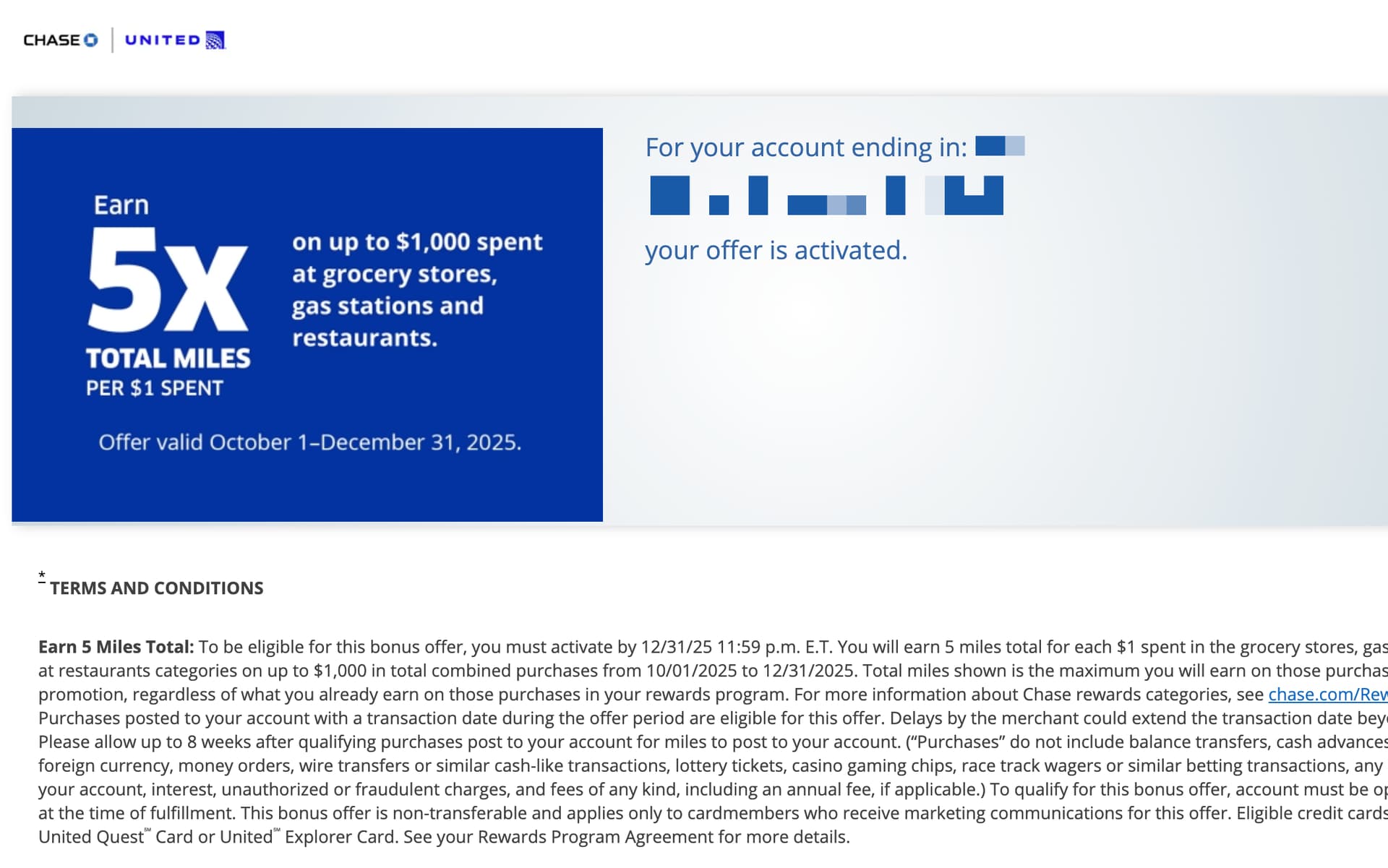 刚看到 Chase offer 里面 UA 的卡有个 5x miles: on grocery/rest/gas up to $1000 spending: