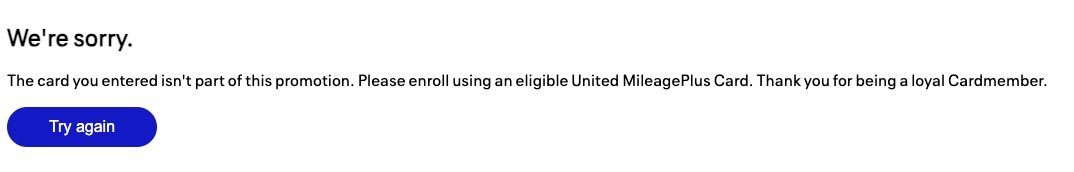 The card you entered isn’t part of this promotion. Please enroll using an eligible United MileagePlus Card. Thank you for being a loyal Cardmember."