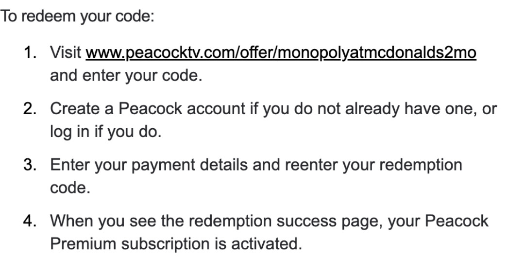 Your prize redemption code for your Peacock Premium Two-Month Subscription is: PEAT3NGP766AXQL