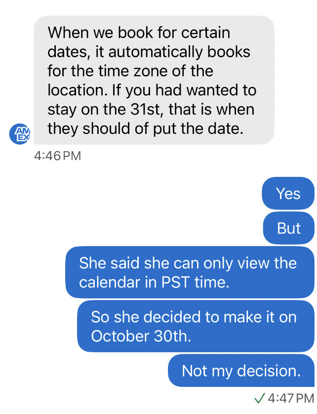 随后马上重新自己下单了一次,并且联系Amex App客服,他们说“我们帮你们预定的时候看到的时间就是当地时间”…