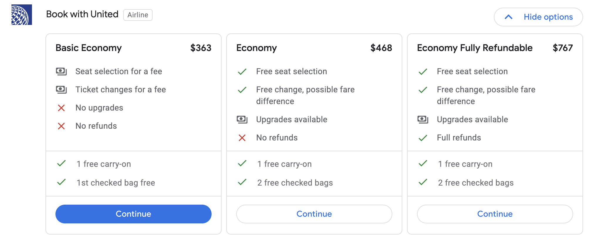 还要和UA BE买票后可以加$50变econ来对比,相当于付$50退100% credit。