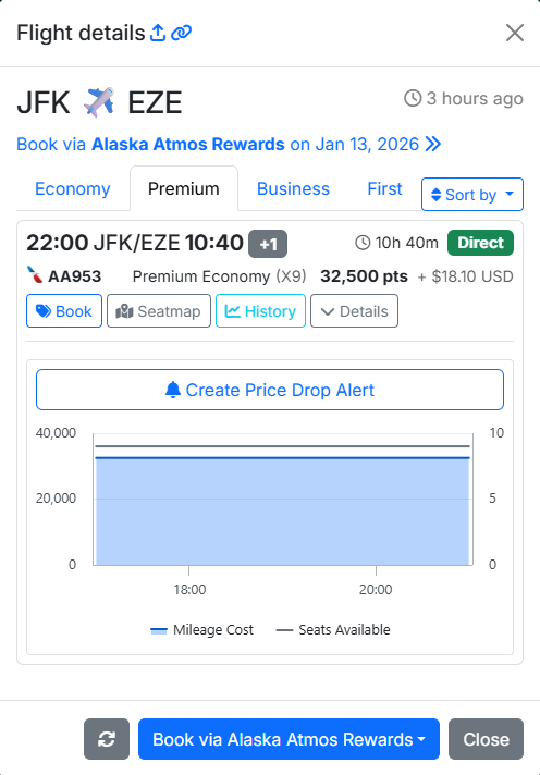 比较了AS,JFK-EZE 经济25K+$18.1,高经32.5K+$18.1