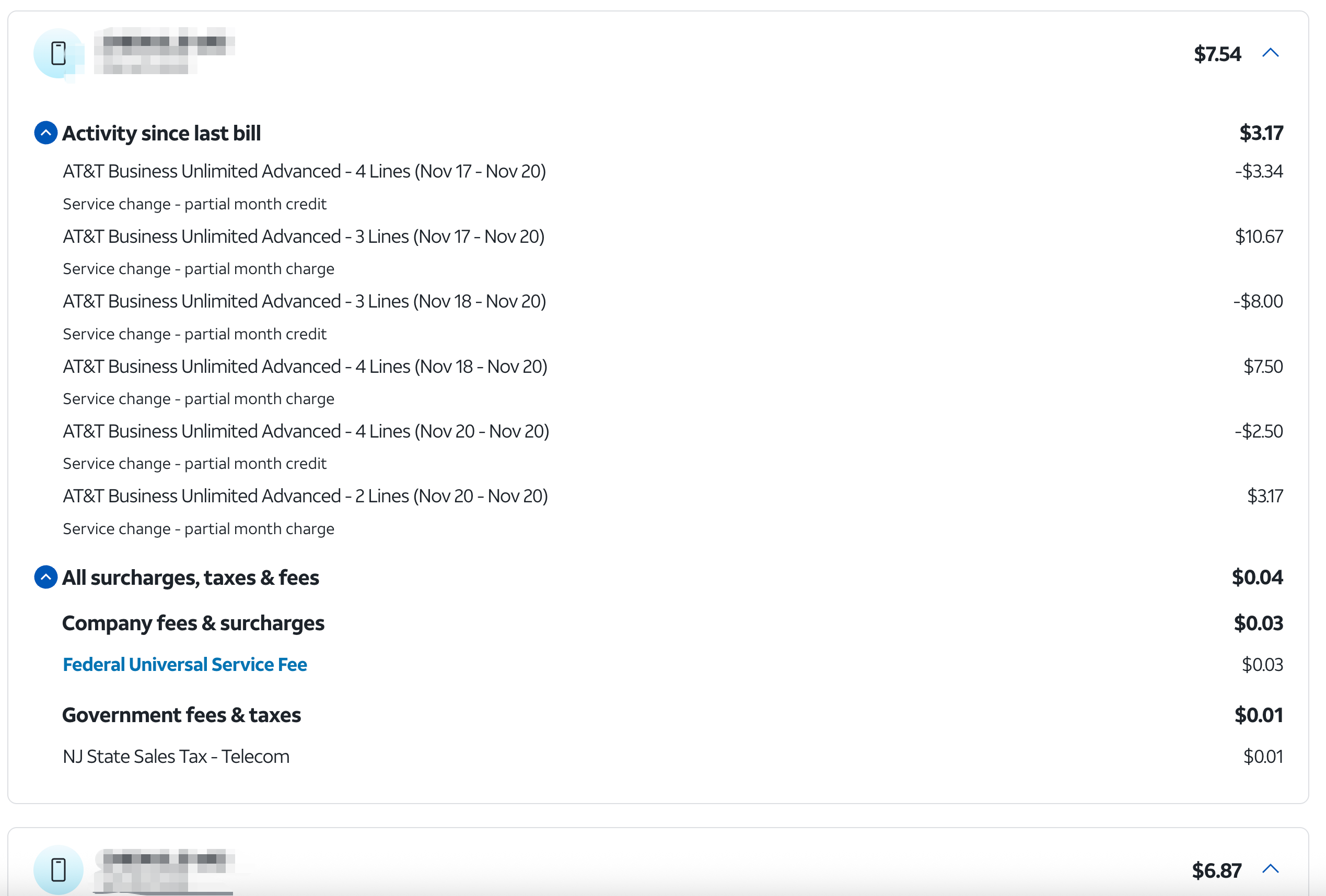 11 月 19 号还是 20 号,我去 Costco 把 4 条线一起转到了 T mobile,按照论坛里之前讨论过的说法,就是在 ATT 这一个 10/21-11/20 的付费周期中转走了,结果最近又收到 ATT 的 bill,每条线 7 块钱左右,且又 charge 了我 11 月 17、18、19、20 这几天的费用?