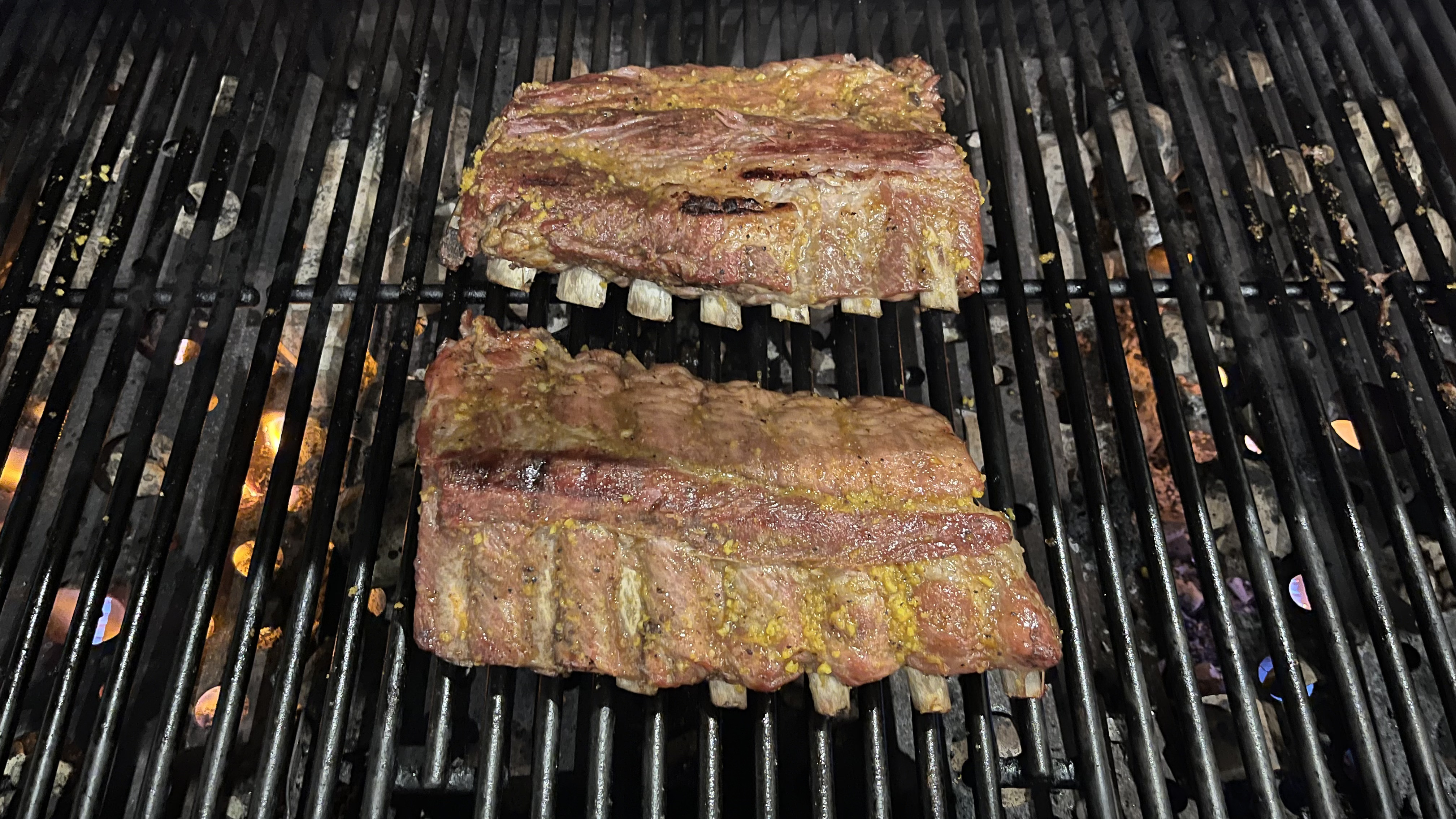 - 布局: 一侧开火,肋排放另一侧闷烤,骨头朝下。酒店烤炉没温度计,火力全凭平时做饭的直觉。