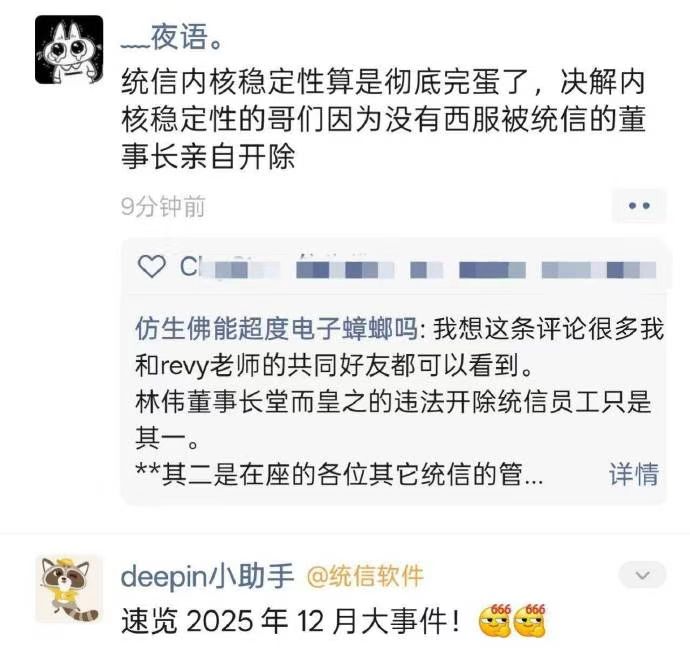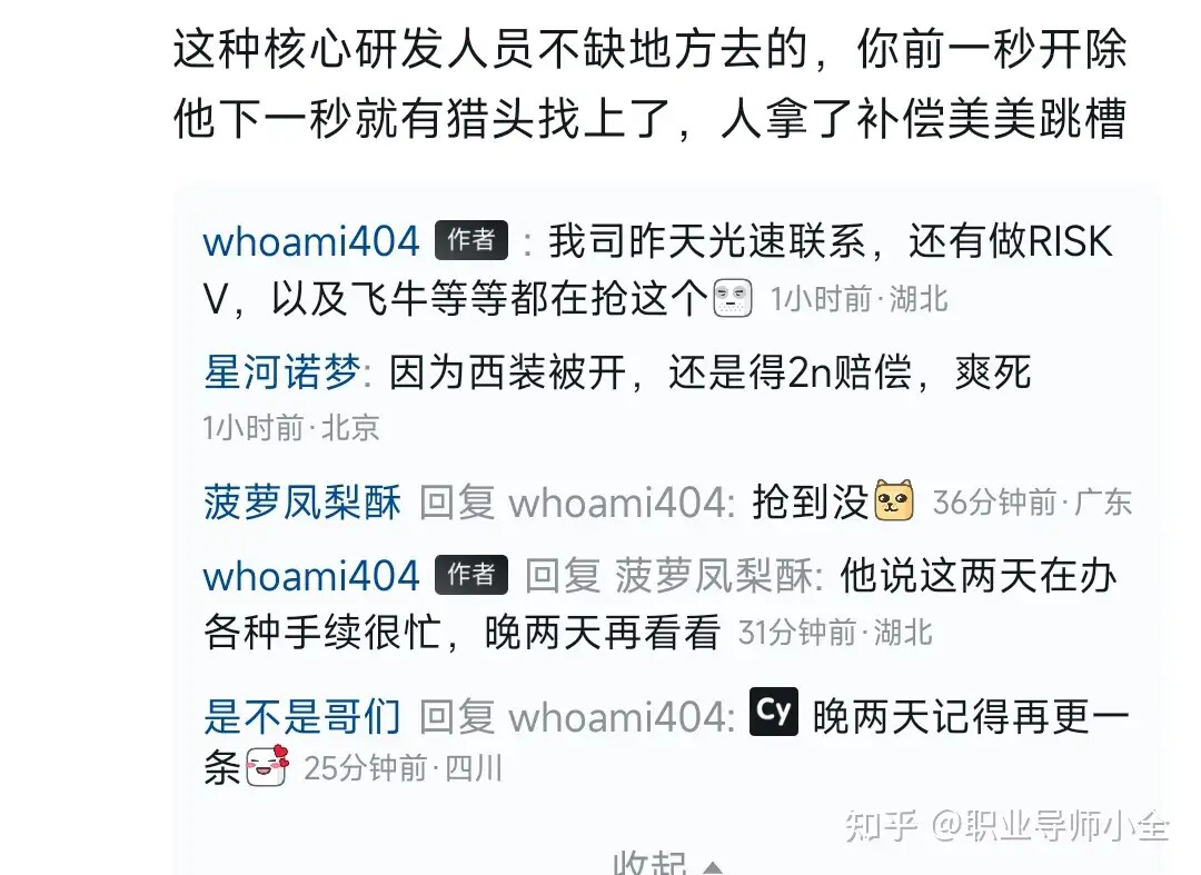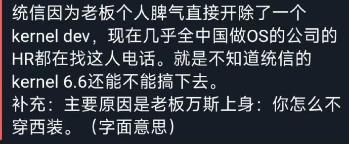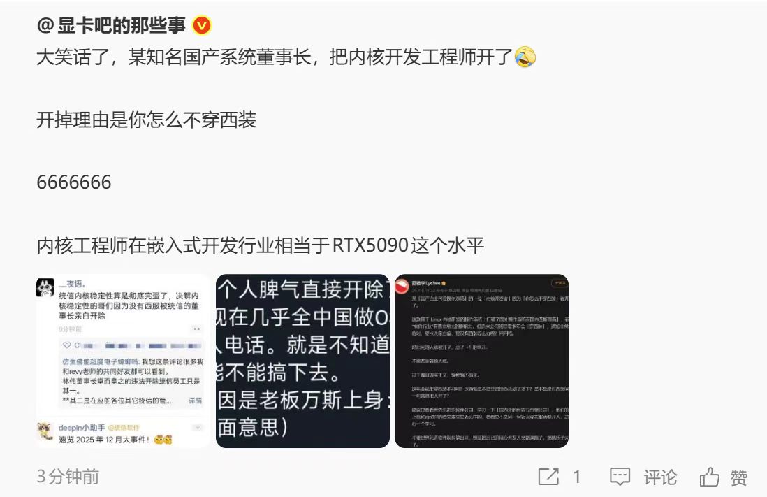 没想到裁员裁到大动脉的这种短剧,竟然真的能在现实中发生。内核开发大牛质疑领导要求团建穿西装,然后董事长直接将其开除,据说已经拿2n离职了。跟风质疑的也好像被开了。
